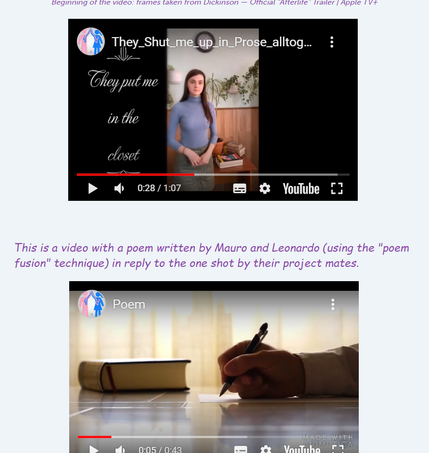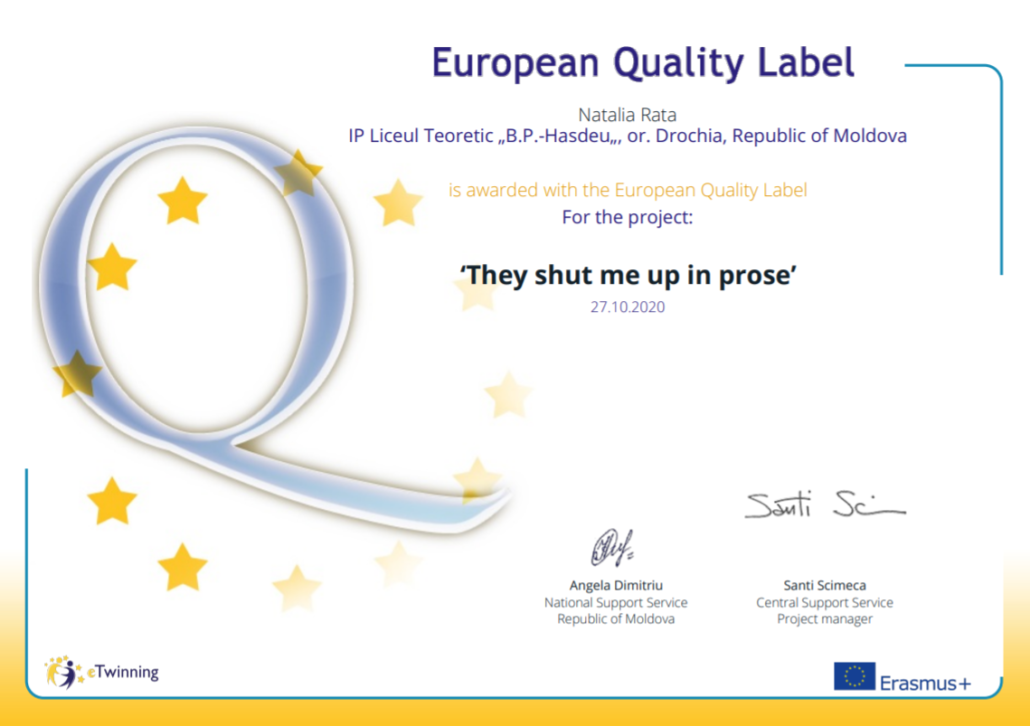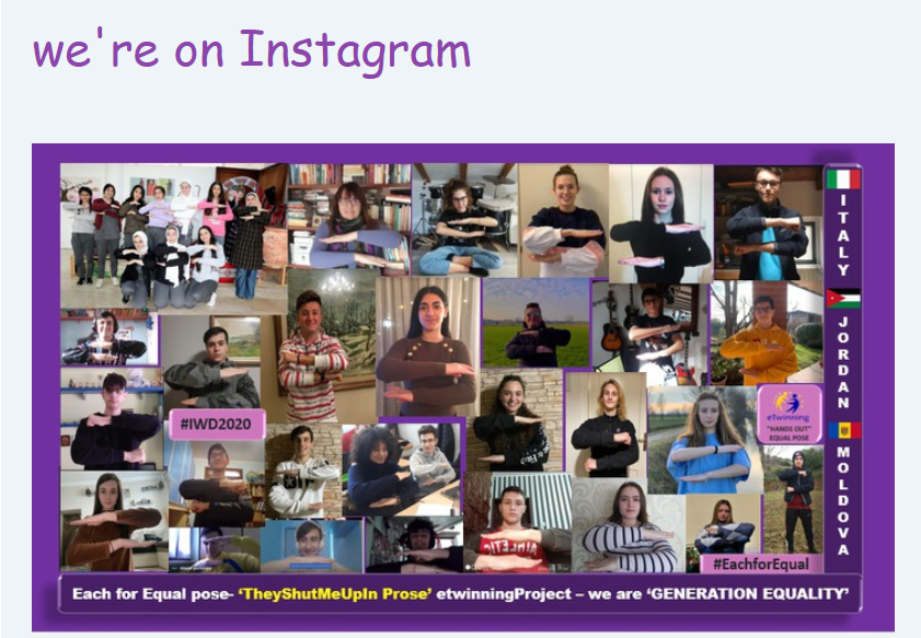 Din anul 2018, de îndată ce am devenit membru eTwinning am aderat la proiecte create de alți profesori pentru a diversifica activitatea elevilor mei. Un an de muncă asiduă și deja din 2019 am început să creez proiectele mele în care invitam parteneri din alte țări. Anul trecut, împreună cu partenerii din Iordania și Italia am inițiat un proiect comun ”They Shut Me in Prose”. Titlul proiectului s-a inspirat din primul vers al unui poem de Emily Dickinson, în care autoarea își exprima rebeliunea împotriva unei societăți patriarhale care îi interzicea să fie poetă. De fapt, la sfârșitul secolului al XVIII-lea, aspirațiile femeilor erau adesea sacrificate în numele acelor stereotipuri de gen care caracterizau societatea conformistă.