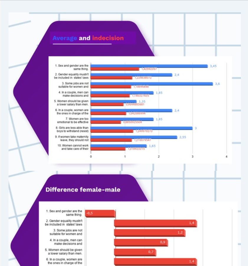 Din păcate, stereotipurile de gen sunt în jurul nostru, împreună cu sexismul și discriminarea pe criterii de gen. Gândirea critică a fost o abilitate fundamentală care trebuie dezvoltată prin colaborare (echipe transnaționale de elevi de sex masculin și feminin), creativitatea și abilitățile de alfabetizare digitală au fost, de asemenea, dezvoltate în timpul proiectului. Tehnologiile nu au fost folosite de dragul lor, dar a existat un raționament pedagogic în spatele utilizării lor pentru a obține o învățare semnificativă. Fiecare instrument trebuia folosit pentru a atinge un obiectiv specific în procesul de învățare / predare. În acest fel, elevilor li s-a oferit posibilitatea de a-și dezvolta gândirea critică, de fapt, trebuia să poată afla informații prin webquest-uri și apoi să le folosească în discuții semnificative de clasă desfășurate atât oral în cadrul întâlnirilor online, cât și într-o formă scrisă pe tabla virtuală, în forumurile etwinning sau în prezentări. Elevii au colectat date pregătind sondaje – utilizând Google Forms – și apoi le-au analizat și discutat. De asemenea, elevii au experimentat scrierea colectivă / colaborativă realizând cărți electronice folosite pentru a spori abilitățile de scriere și colaborare a elevilor într-o formă de „autor multiplu” în care un grup de elevii a lucrat împreună pentru a produce un text comun. Nu în ultimul rând, tinerii au folosit rețelele de socializare pentru a face campanie pentru cauza lor, pentru a împărtăși conținut valoros, a amplifica și a crește gradul de conștientizare.